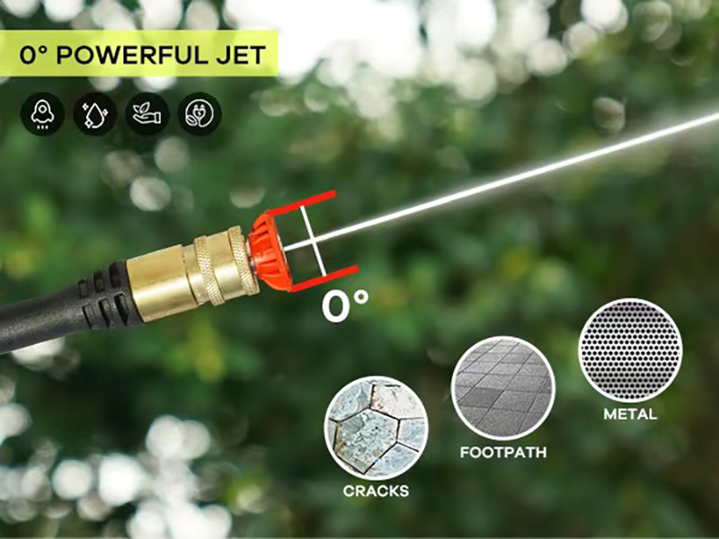 0° Power Jet -suutin tuottaa erittäin kapean, suoran korkeapainevesivirran, jolla on suurin iskuteho ja läpäisykyky. Se sopii erinomaisesti erittäin itsepintaisen lian, ruosteen, rasvan tai maalin poistamiseen, ja sitä käytetään yleisesti kovien pintojen, kuten betonihalkeamien, metalliosien tai vaikeasti saavutettavien korkeiden alueiden puhdistukseen. Suuren paineen vuoksi sitä ei tulisi käyttää hauraille tai pehmeille pinnoille vaurioiden välttämiseksi. Säilytä aina turvallinen etäisyys käytön aikana, äläkä suuntaa suihkua ihmisiin tai eläimiin. Tämä suutin on suositeltu vain ammattilaiskäyttöön tai tiettyihin raskaisiin puhdistustehtäviin.